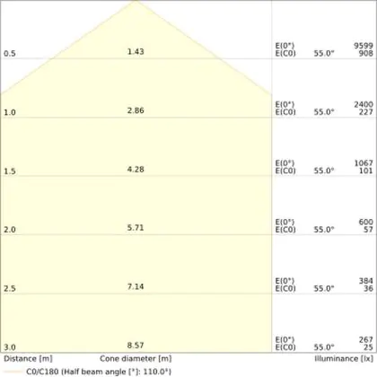 De gradenbundel geeft informatie over hoe breed het licht wordt uitgestraald. Dit zit tussen de 0 en 360 graden (D). Hoe kleiner de hoek, hoe specifieker de lichtbundel is. Over het algemeen is een smalle gradenbundel perfect voor sfeer- of accentverlichting, terwijl een brede gradenbundel ideaal is om grote oppervlaktes te verlichten.