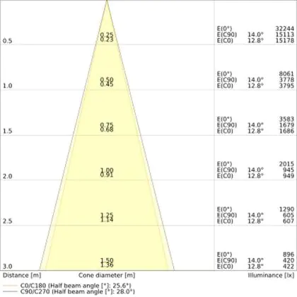 De gradenbundel geeft informatie over hoe breed het licht wordt uitgestraald. Dit zit tussen de 0 en 360 graden (D). Hoe kleiner de hoek, hoe specifieker de lichtbundel is. Over het algemeen is een smalle gradenbundel perfect voor sfeer- of accentverlichting, terwijl een brede gradenbundel ideaal is om grote oppervlaktes te verlichten.