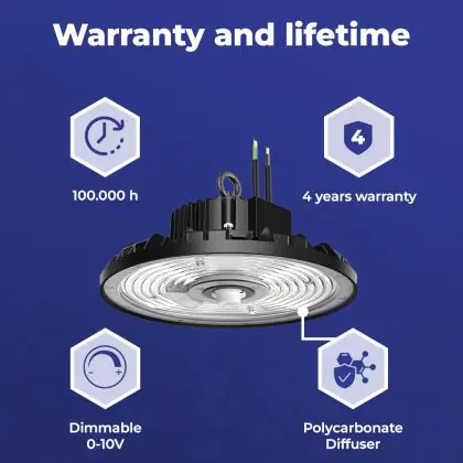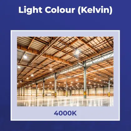 Deze LED High-bay bezit een enorme lichtopbrengst van 32000 lumen! Dit hoge aantal laat zien dat een armatuur zoals deze ook vanaf een grote hoogte nog steeds zijn werk doet. Hang je een High-bay armatuur zoals deze in een ruimte met lagere plafonds, dan is de hoeveelheid licht simpelweg te krachtig en te fel. Met als gevolg dat wanneer mensen in het licht kijken, ze direct worden verblind. Vanaf hoge plafonds (6 tot 14 meter) is dat een ander verhaal. Ook niet onbelangrijk om op te letten is de kleurtemperatuur. Deze is bij dit product: 4000K - Koel Wit. Twijfel je over de juiste kleurtemperatuur voor een grote oppervlakte? Kies dan voor koel wit (4000K). Deze lichtkleur heeft een natuurlijke tint en houdt werknemers in productie-omgevingen alert.